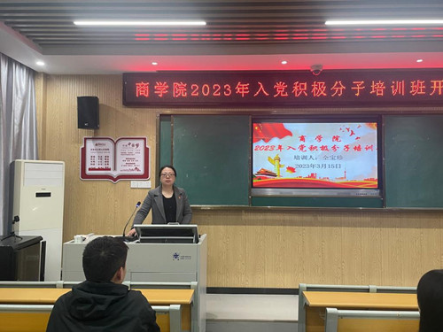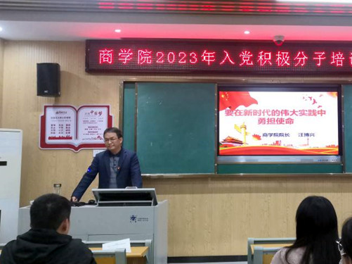为学习贯彻习近平新时代中国特色社会主义思想和党的二十大精神,帮助入党积极分子进一步掌握党建知识,提高综合素质,3月15日晚,商学院在笃学楼N101室举行入党积极分子培训班开班仪式。院长汪博兴,学工党支部书记梁光源、办公室主任齐兴华、学工党支部组织委员仝宝珍及84名入党积极分子参加开班仪式。