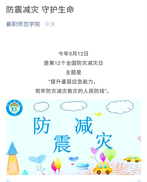 5月12日是全国第12个全国防灾减灾日。师范学院(特殊教育学院)利用官方微信等形式,开展以“防震减灾 守护生命”为主题的安全知识宣传,教育引导学生识别灾害风险,提升减灾技能,珍爱呵护生命。