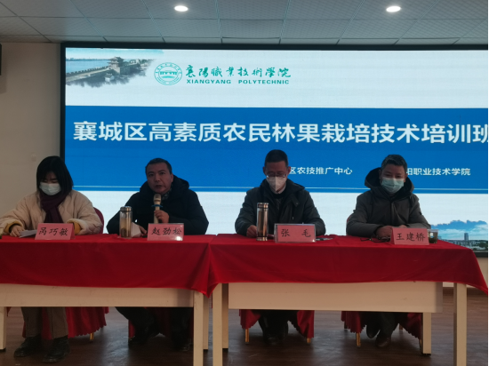 2023年1月4日,学校和襄城区农业技术推广中心联合举办的林果产业栽培技术培训班在卧龙镇新建村正式开班。当天上午,农学院院长赵劲松和襄城区农业技术推广中心主任张毛参加开班仪式。本次培训为期7天,全村贫困户、果树种植户、林站工作人员、村支两委及驻村干部共67户参训。此次培训的目的旨在解答林果栽培中遇到的难题,扎实推进林果产业发展。