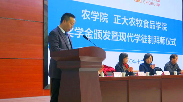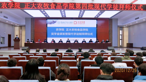 12月29日下午,农学院(正大农牧食品学院)2020年度正大奖学金捐赠暨第四批现代学徒制拜师仪式在智造大楼学术报告厅举行。正大襄阳产业链襄阳正大农牧食品有限公司、襄阳正大有限公司、正大食品(襄阳)有限公司助理副总裁莫小雨及各公司人事主管;学校副校长余荣宝,教务处、产学研工作处相关负责人,农学院全体师生参加活动。
