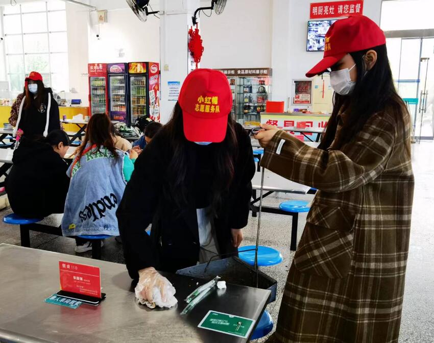 活动期间,志愿者分为两组,每组10人。在知恩堂张国强经理的统筹安排下,分别在食堂一楼和二楼负责归置清洗餐盘、擦拭座椅、清扫地面等工作。“小红帽”志愿者任劳任怨,以实际行动诠释着青年的奉献和担当精神。
