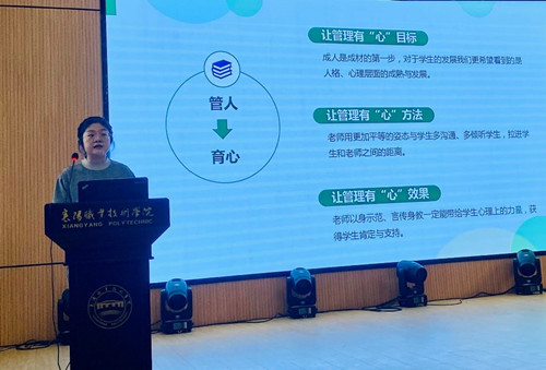 学校心理中心教师白一鹭以班主任工作理念为基础,呼吁全体班主任在班级管理中要有“心”方法、“心”目标、“心”效果。她建议班主任以一种更加欣赏性的、独特的、开放的眼光去面对学生们的潜能和动机,要从心底相信积极心理学的力量,科学关爱学生,相信学生向上生长的潜能,以积极的心理素质影响学生,成为学生潜移默化的心理榜样、幸福模范。