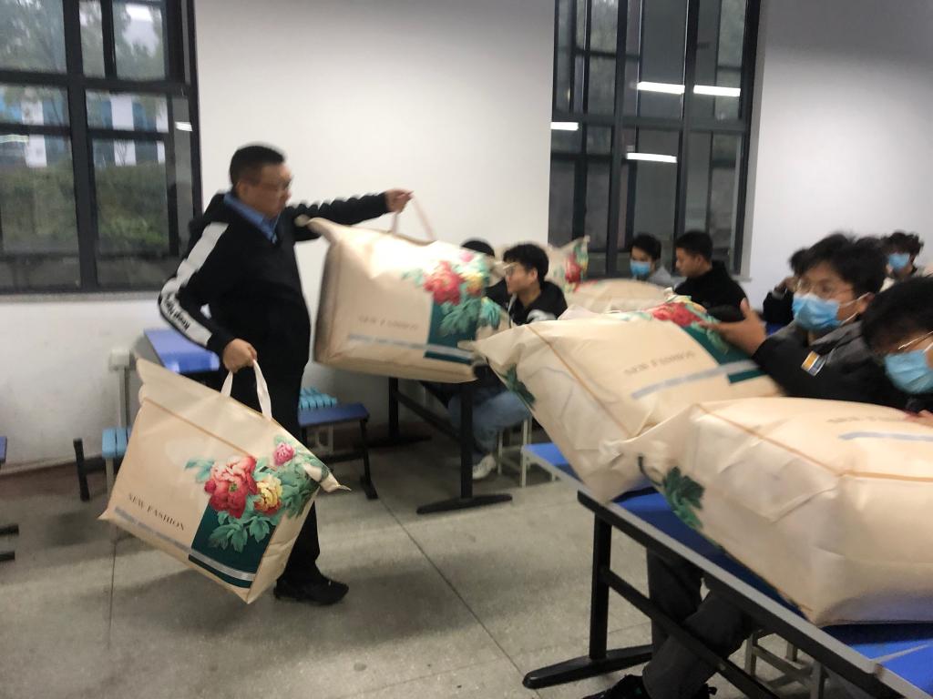 汽车工程学院党总支书记李先国为同学们分发了棉被,并对同学们提出三点寄语。第一,温度骤降,希望同学们在做好防疫的同时注意个人保暖;第二,希望同学们把这份爱心传递下去,有老师和同学们的温暖相伴,不再寒冷孤单;第三,希望同学们发扬“奉献、友爱、互助、进步”的志愿者精神,积极参加社会公益活动和志愿服务活动,传递学校大爱文化。