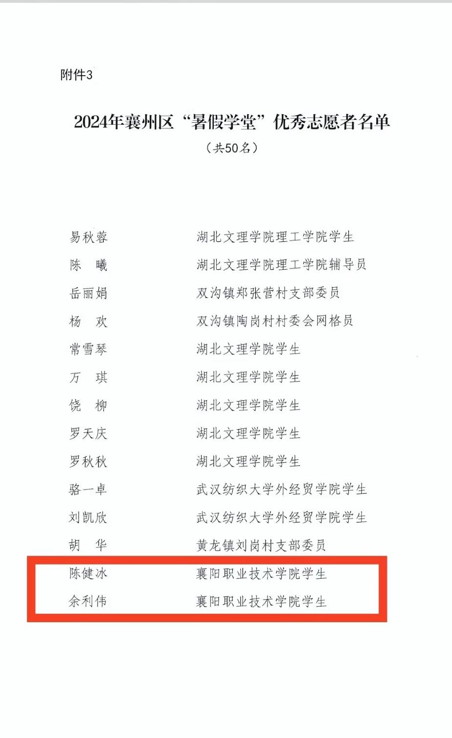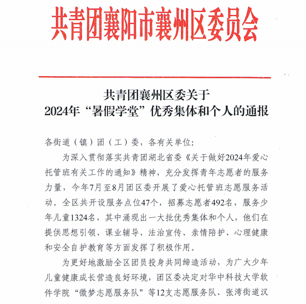 近日,共青团襄州区委发布2024年“暑期学堂”优秀集体和个人的通报,信息技术学院“伴读青春”志愿服务队凭借优异的志愿服务获评“优秀志愿服务队”。学生陈健冰、余利伟获评“优秀志愿者”。