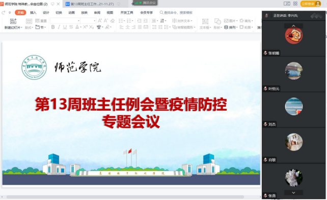 为筑牢疫情防控安全防线,守护师生生命健康,11月20日晚,师范学院召开线上疫情防控专题会议。师范学院党总支书记张丹出席会议,全体辅导员和班主任参加。