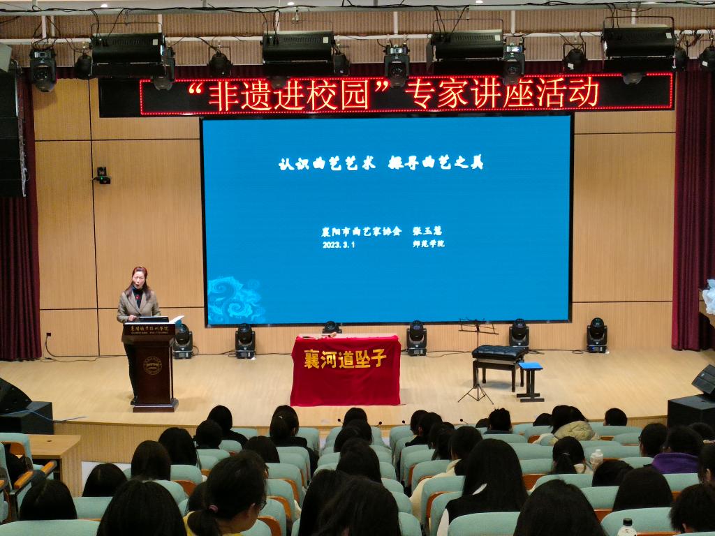 3月1日,师范学院在博学楼一楼报告厅举办非遗讲座进校园活动。中国曲艺家协会会员、湖北省曲艺家协会理事、襄阳市曲艺家协会常务副主席、非遗襄河道坠子传承人张玉慧带来专题讲座《认识曲艺艺术,探寻曲艺之美》。