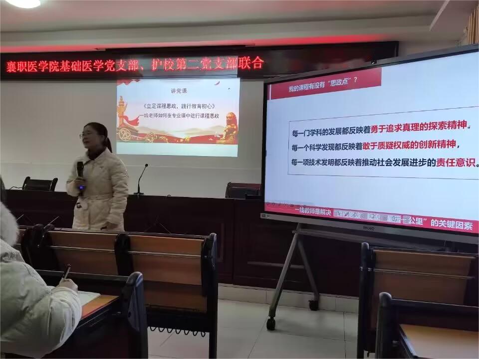 为深入学习贯彻习近平新时代中国特色社会主义思想,教育引导各位党员教师践行初心使命,强化责任担当,12月26日,医学院基础医学党支部联合襄阳市护士学校第二党支部,开展“学习身边榜样 立足岗位作贡献”交流活动。襄阳市护士学校党总支书记、校长佘传江,医学院党总支副书记李琦,医学院基础医学党支部书记胡海云、护校第二党支部书记王建新及两支部党员教师参加活动。