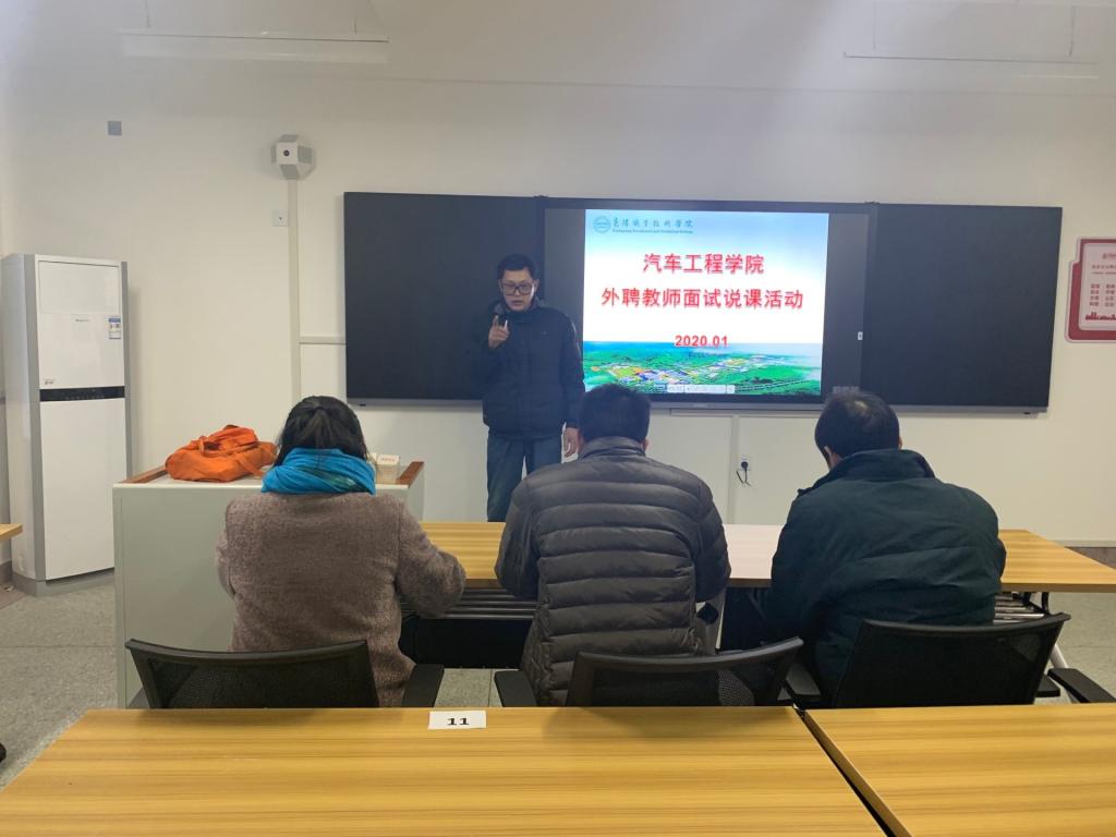 1月14日,汽车工程学院组织外聘教师在智造大楼进行说课试讲活动。院长程洪涛、副院长沈先飞、教学秘书马洋和二级督导参加了活动。