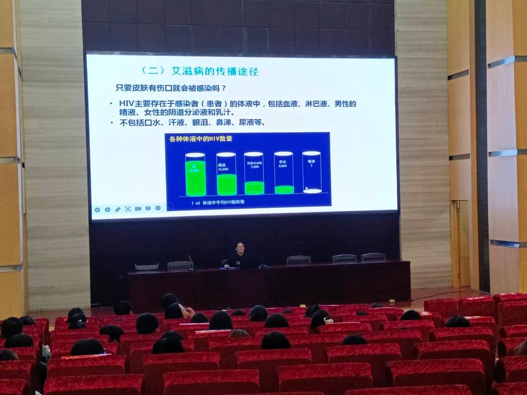 四位医生从艾滋病的认识、传播途径、危害等角度,为学生上了一堂生动的健康知识普及课。学生积极参与问题抢答,现场学习氛围浓厚。