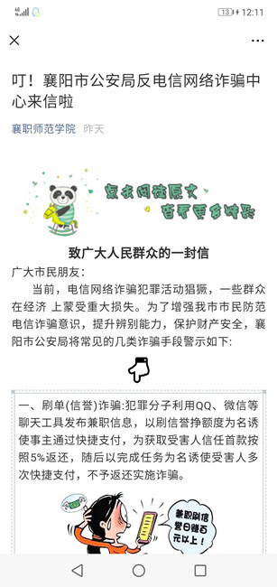 4月1日,师范学院(特殊教育学院)继防奖助贷诈骗宣传教育后再出“硬招”,结合市公安局反电信网络诈骗中心“致广大人民群众的一封信”中列举的常见的9类诈骗手段,利用官方微信等多种形式,对全体师生再宣传、再教育、再警示,进一步增强师生防骗意识,提升师生辨别能力,确保师生宅家财产和人身安全。