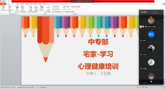为了解学生疫情期间心理健康状况,疏导学生长期居家的焦躁情绪,缓解网课学习的倦怠感,5月27日晚,中专部组织开展了“宅家-学习”线上心理健康培训会。中专部18、19级寝室长及各班心理委员参加培训。学生科王亚斯主讲。