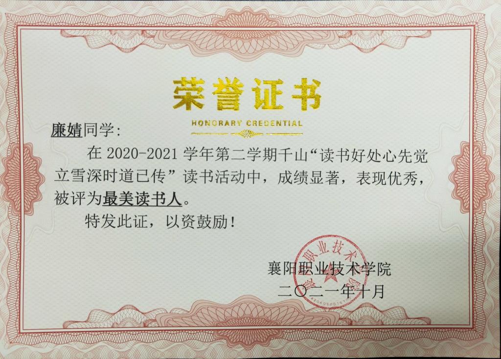 廉婧,是班级的学习委员,是学院的一等奖学金获得者,但她心里最珍惜的,是阅读点亮了她的大学生活。课外时间她都会去图书馆看看书籍、写写心得,因此连续两年荣获校园“最美阅读人”称号。