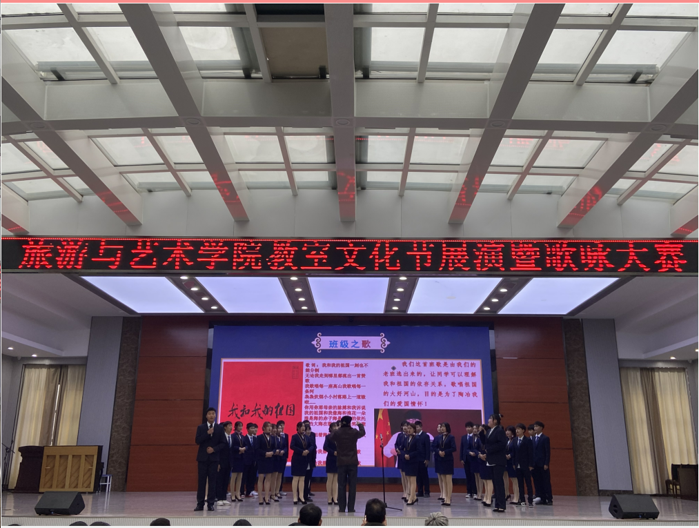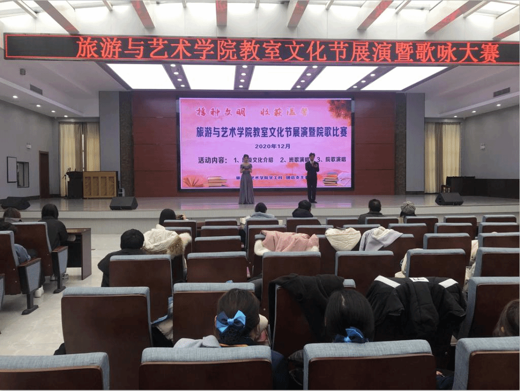 为巩固创文成果,加强学院文明建设,给学生教育管理注入文化元素,12月3日下午2点半,旅游与艺术学院在智能制造四楼学术报告厅隆重举办“教室文化节展演暨歌咏大赛”。旅游与艺术学院党总支书记王壮、全体学工人员、20级全体班主任和学生参加本次活动。