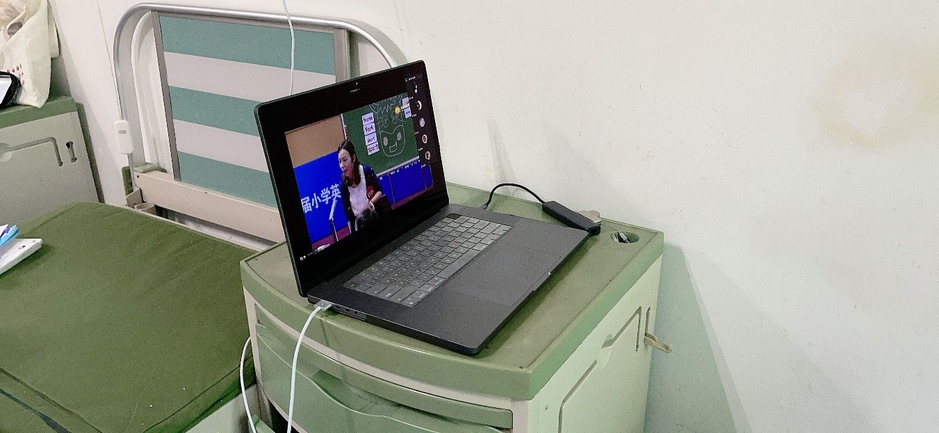 虽然线上授课存在不少困难,但老师们心系学生,攻坚克难。英语教育专业研究室主任王玮,在医院照顾刚做完手术的家人,静默期间不能离开医院,王老师克服设备和环境的限制,坚持在病房开展线上教学,并高质量完成教学任务,以自己的实际行动诠释了教师的责任和对学生的担当。