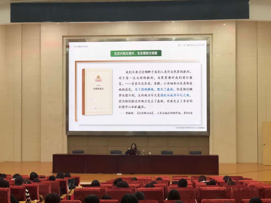 胡唯老师从“美丽之问”“美丽之答”“美丽之路”“美丽担当”四个板块,引导学生深刻认识新时代背景下建设美丽中国的重要意义,科学认识中国特色社会主义生态文明建设的历史进程、理论内涵和实践探索坚定建设美丽中国的信念,提高生态文明素质,让生态文明价值观扎根新时代青年大学生思想,进而培养青年大学生的生态文明行为。讲座穿插图片和视频,内容丰富,学生反响热烈,效果良好。