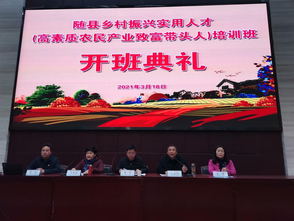 3月18日上午,由随州市随县组织部、随县农业农村局主办,我校旅游与艺术学院承办的随县乡村振兴实用人才(高素质农民产业致富带头人)培训班在图书馆一号学术报告厅举行开班仪式。随县组织部副部长阳斌、随县农业农村局副局长严清明,我校继续教育学院院长沈传华,旅游与艺术学院党总支书记王壮、院长王惠,以及55名学员出席了开班仪式。