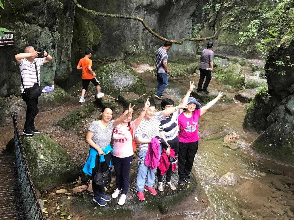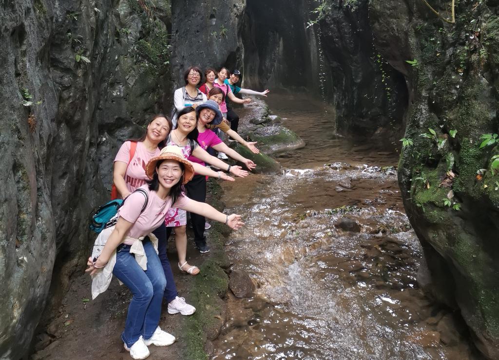 幽静的峡谷,裹着一层苍翠的青苔,峡谷内飞瀑成群、灌木丛生,潺潺溪水由深谷流出,整个峡谷保留着原始的喀斯特地貌。老师们带着夏日的热情,置身峡谷内,感受曲径通幽、别有洞天的翡翠峡带给大家的幽静与清凉。