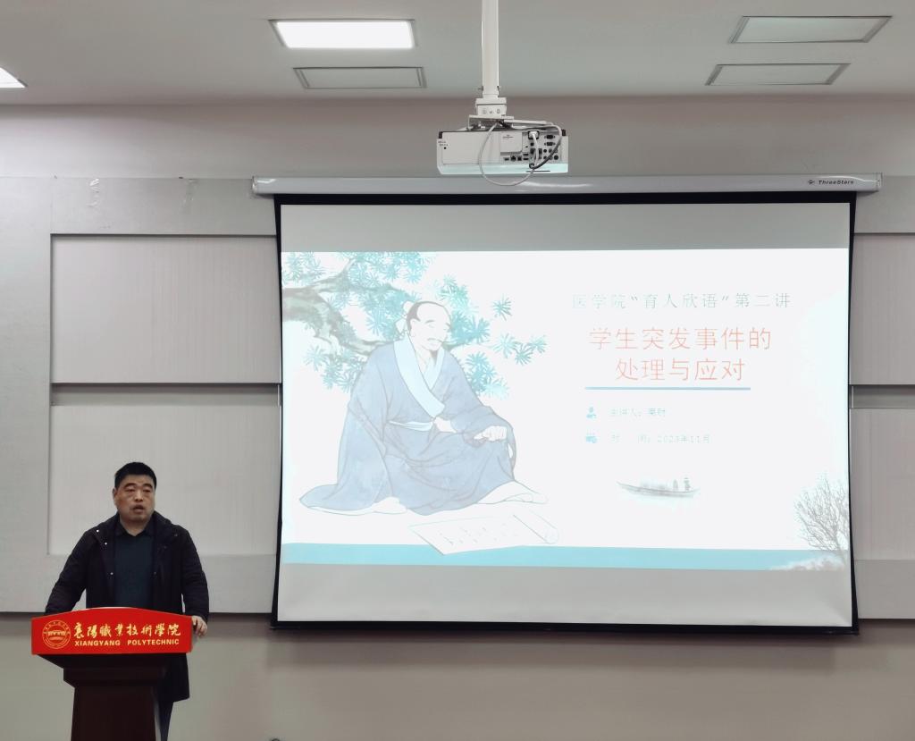 为挖掘和展示大学生思想政治教育工作者在立德树人工作上的先进经验和感人事迹,唱响“为党育人,为国育才”的主旋律,近日,医学院在阶一教室举办“大学生突发事件的应对机制”讲座。医学院学工科长栗财担任宣讲人,全体班主任参加活动。