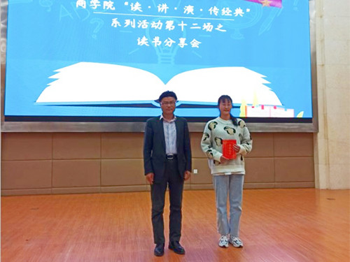 活动中,9名选手依次上台,分享他们读过的一本经典。经现场评审,揭晓一、二、三等奖。方基志等院部领导分别为获奖选手颁奖。