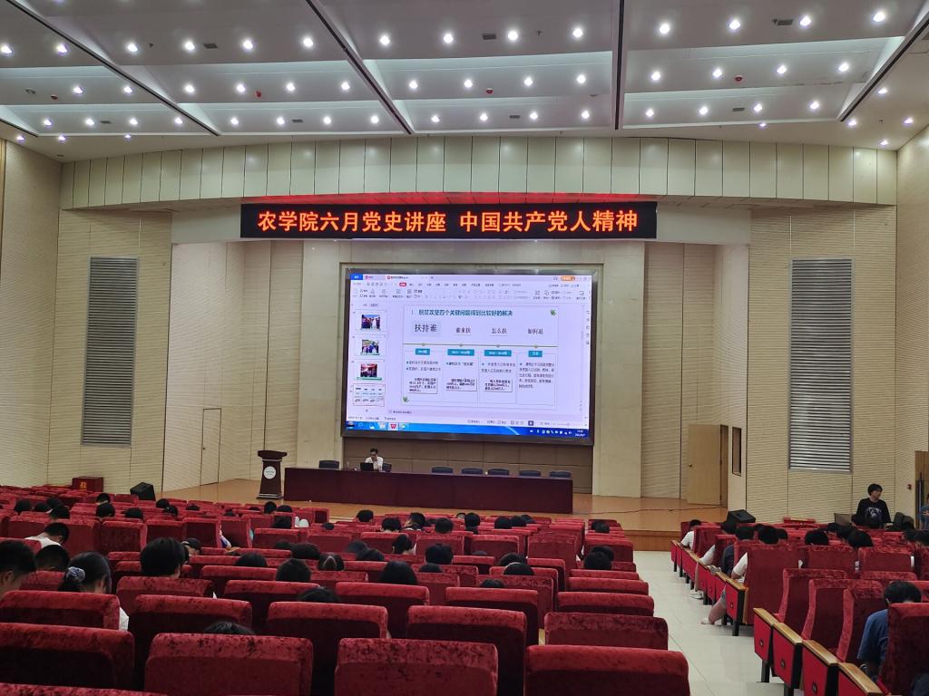 6月7日晚七点半,农学院在图书馆二号报告厅开展6月份党史讲座——中国共产党人精神谱系之脱贫攻坚精神。马克思主义学院张爱民老师主讲。