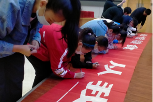 团课结束后,全体2020级新生在横幅上签名,郑重承诺:珍惜粮食,从我做起。