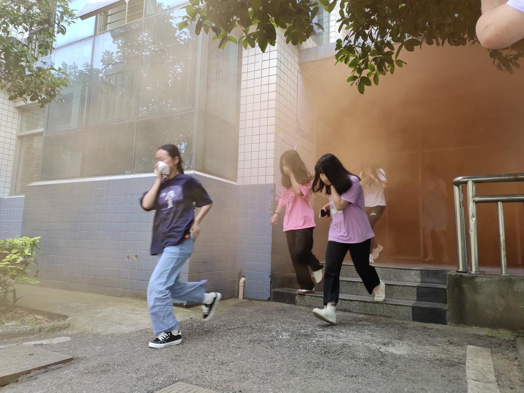 随着一阵急促的警报声响起,演练正式开始。同学们用湿毛巾捂住口鼻,快速沿着楼梯间消防安全指示标志,半蹲弯腰前行。整个过程,同学们不推不挤、沉着冷静、快速有序地疏散到安全位置。