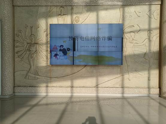 一日一宣传,教育常态化。利用博爱楼电子屏,每天滚动播放预防电信网络诈骗的相关知识,体现安全教育的反复性和长期性。