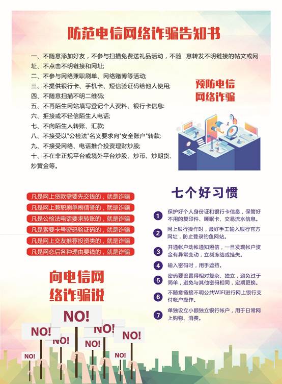 一人一手册,宣传点对点。印制《防范电信网络诈骗告知书》,发放到每位学生手中,引导学生学习、反思,让安全教育入脑入心。