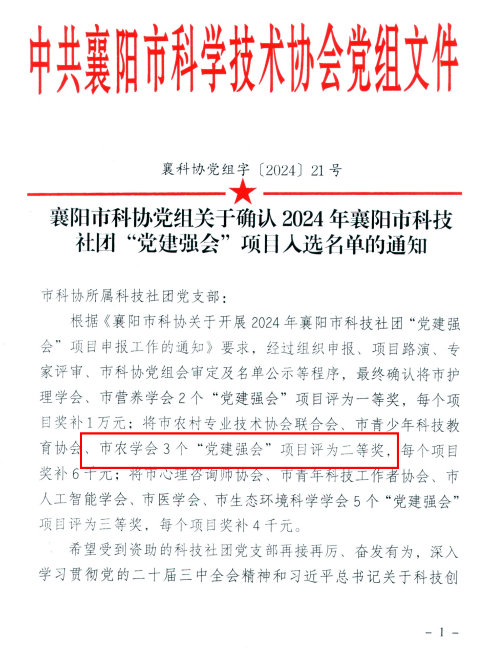近日,由襄阳市科学技术协会主办的2024年襄阳市科技社团“党建强会”项目比赛落下帷幕。十多家市级科技社团同台竞技。农学院与市农学会联合党支部展演的《“五四三”党建工作法服务乡村振兴》项目斩获二等奖。