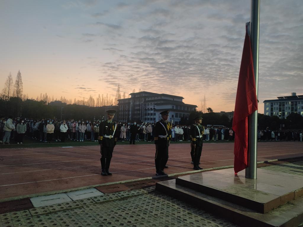 7点整,英姿飒爽的国旗护卫队成员迈着整齐划一的步伐,庄严地护送着鲜艳的五星红旗缓缓走向国旗广场。国歌奏响,五星红旗伴随着振奋人心的歌声冉冉升起,点燃了在场师生满腔炽热的爱国之情。