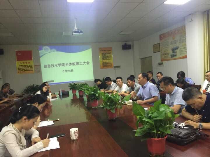 6月24日下午,信息技术学院召开全体教职工大会,安排部署期末考试、招生就业、学生安全等重点工作。