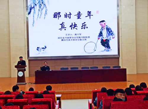 黄大军运用国画,展示了童年时期摸鱼、过关、滚铁环、石头剪刀布等无忧无虑、童趣开心的时光,通过上世纪80年代与90年代童趣玩乐的对比,揭示快乐与财富无关。讲座中,黄大军通过图文并茂的形式,再现了“老鹰抓小鸡”“扔沙包”“摸瞎子”等传统游戏,指出闭门独乐不如群体同乐。他同时以亲身经历,介绍了自己在摄、写、演、唱、画中寻找到的乐趣,引导同学们定准人生目标与规划,脚踏实地,勇往直前,在寻找快乐的同时,实现伟大梦想。