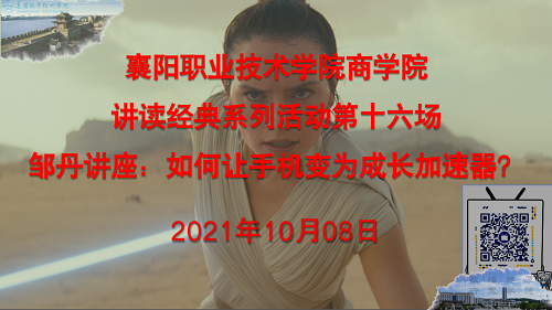 活动中,邹丹老师从竹简、纸张、电脑和手机四种媒体演变的历史分析指出,手机应用野蛮生长的时代即将终结;从大国崛起、民族复兴和强国博弈的视野,鼓励同学们做时代大潮中的大水大鱼;从游戏、成长和创新的视角,启发2021级新生思考自己最重要的人生目标,抵制诱惑,学有所成。最后,邹老师给同学们提出充分发挥手机成长威力的三招:在襄职找到对自己成长最有帮助的老师,必要的时候借助工具锁定手机,安装“得到”之类学习型App,以攻为守,增加手机应用中成长类的时间。