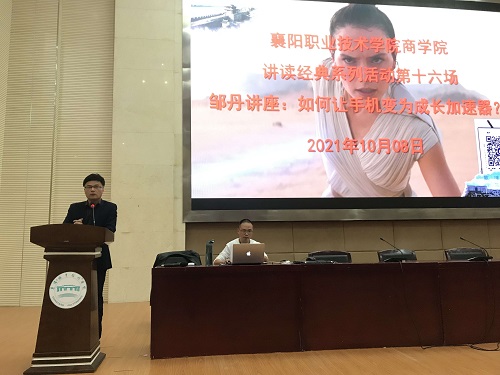 10月8日晚,商学院“讲读经典”系列活动第十六场在图书馆二号报告厅举办。本次活动由商学院党总支书记方基志主持,邹丹老师分享“如何让手机变为成长加速器”。商学院2021级全体新生参加了此次讲座。