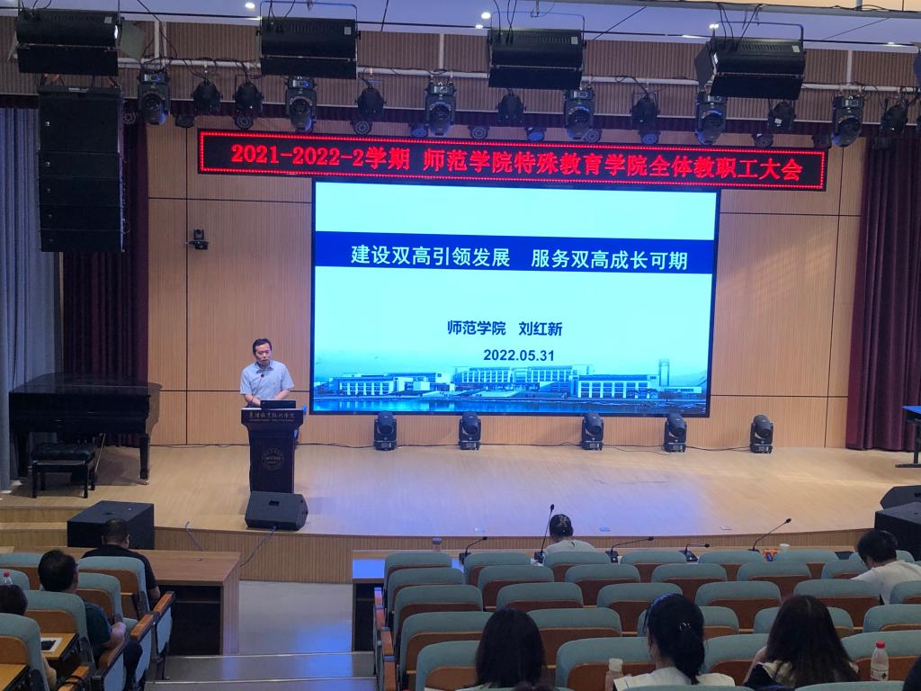 5月31日下午,师范学院在博学楼演播厅召开第二期培训会。会议由院长刘红新主持。全体教职工、外聘兼职教师等出席会议。