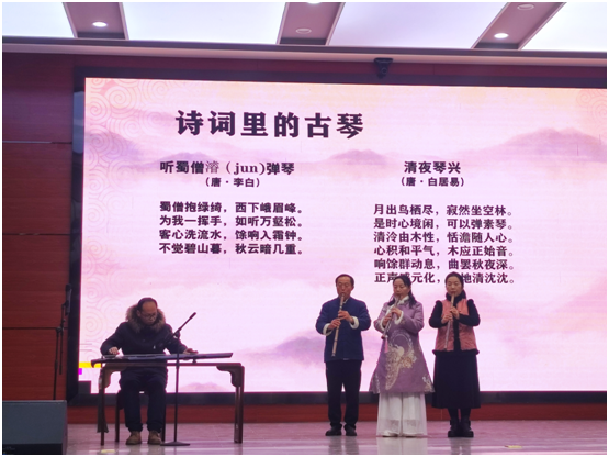 薛献忠及其团队通过现场古琴与洞箫合奏的方式,引导同学们欣赏具有独特风格、韵味和文化涵养的古琴曲,在山水名胜、田野风光、历史故事中体悟古琴曲所传达的情感和内涵。