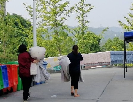 更有贴心的班主任送教材进楼栋,热情的宿管阿姨为学生晾晒被子。