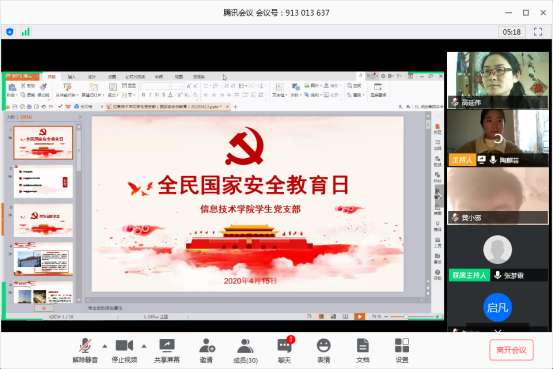 4月15日下午5点30分,信息技术学院党总支学生党支部党员、入党积极分子通过网络平台,在云端开展了“全民国家安全教育日”学习活动。