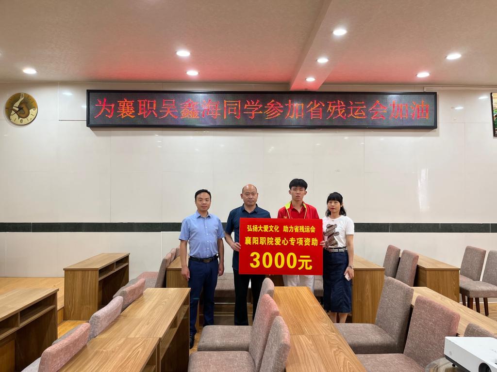 来自农学院的吴鑫海同学,目前正在积极备战湖北省第十一届省残疾人运动会。6月13日上午,学校学工处资助中心主任李书建,农学院学工副院长陈杰军、班主任朱晓俊来到南港宾馆,给吴鑫海同学送去爱心资助金,并鼓励他拿出最好的状态,在比赛中取得好成绩!