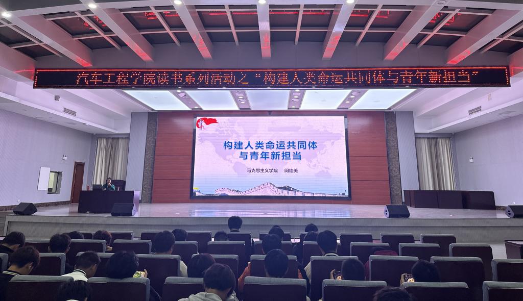 11月6日晚,汽车工程学院在智造工业中心A栋四楼学术报告厅举办《构建人类命运共同体与青年新担当》名师讲党史活动。马克思主义学院闵德美老师应邀担任主讲,23级近700名学生参加活动。