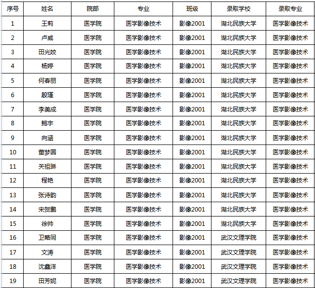 近日,随着2023年湖北省各本科高校第一批次录取情况公布,医学院医学影像技术专业2001班专升本录取创佳绩。影像2001班共33人,本次专升本报考人数为26人,最终录取人数19人,升本率达73%。