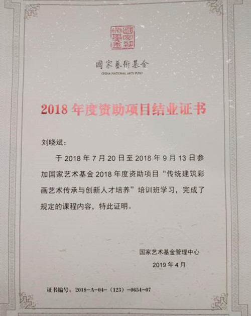 日前,经济管理学院刘晓斌老师完成2018年度国家艺术基金艺术人才培养资助项目“传统建筑彩画艺术传承与创新人才培养”的学习,顺利结业。