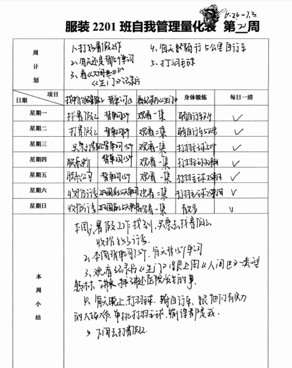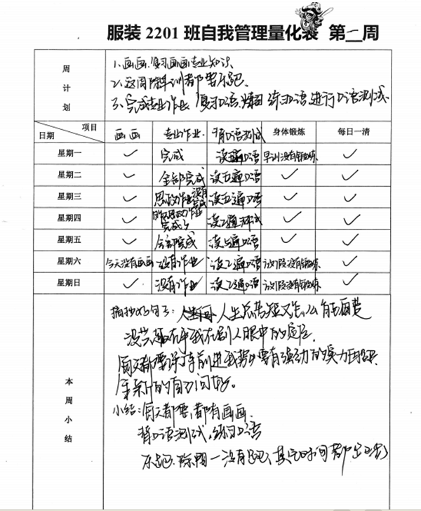 旅游与艺术学院坚持推行创新工作方法,务实开展党员陪伴成长工程,在全院推行“个人自我量化管理”,学生坚持每日打卡,根据学习目标自定任务,逐项有序落实,然后进行当日回顾反思与总结,确保不负韶华,充实有效过好每一天。经过一个学年的施行,该院服装与服饰设计2201班同学坚持打卡,成效显著。
