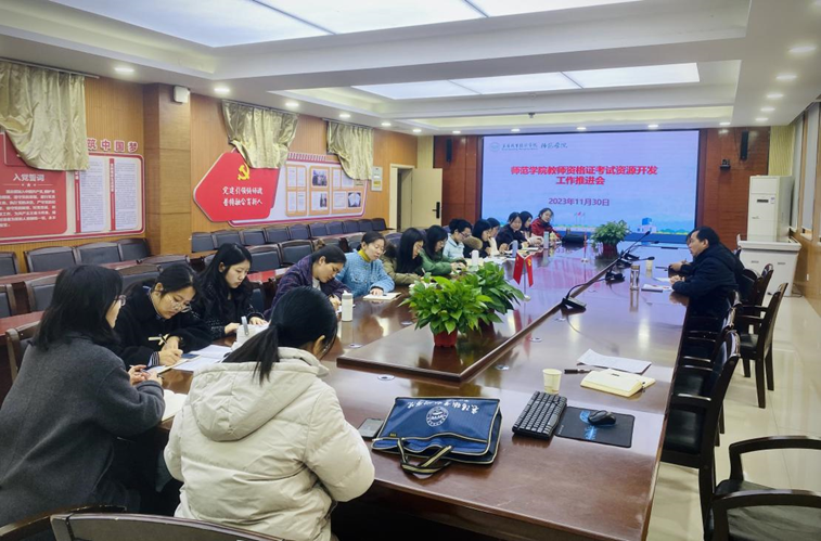 11月30日下午,师范学院在博爱楼四楼会议室召开教师资格证考试资源开发推进会。师范学院院长刘红新,教学秘书汤宇、小学教育研究室主任陈学敏、二级督学王燕及全体新进教师参加会议。
