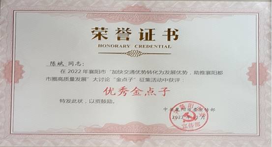 据悉,本次大讨论是襄阳市市委为了落实湖北省第十二次党代会大力发展襄阳都市圈的部署而开展的一场思想大讨论。活动从2022年8月开始启动,为期一个月,大讨论从各地征集到各类“金点子”1200余个,从中评出10名“优秀金点子”。陈斌教授立足新发展阶段,提出我市应立足产教城融合互促发展,将交通优势转化为人力资源集聚优势,全力打造人才高地,为襄阳都市圈发展提供强大智力支撑。该建议被襄阳市电视台等新闻媒体报道,产生很好的社会效应,发挥了高校智库的良好作用。