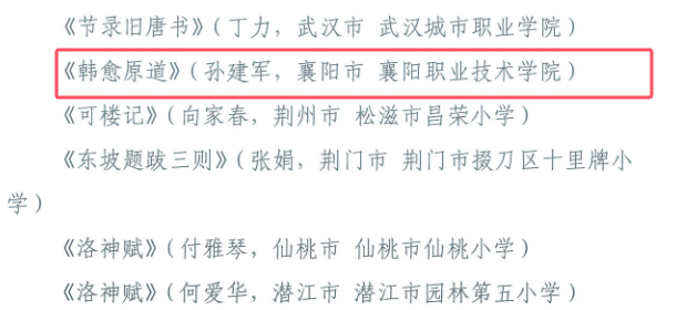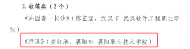 近日,第六届中华经典诵写讲大赛(湖北赛区)揭晓。师范学院共获得三个奖项。其中,孙建军老师的《韩愈原道》在“笔墨中国”汉字书写大赛(湖北赛区)教师组软笔类中荣获二等奖;邵嘉俊同学的《过故人庄》在“诗教中国”诗词讲解大赛(湖北赛区)大学生组中荣获一等奖;龚钰洁同学的《师说》在“笔墨中国”汉字书写大赛(湖北赛区)职业院校学生组软笔类中荣获二等奖。目前,三件作品已进入国赛。