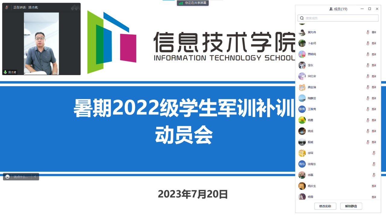 为切实贯彻落实《襄阳职业技术学院关于开展2022级学生军事训练补训工作的通知》文件精神,确保信息技术学院2022级学生军训补训工作有序开展,7月20日下午,信息技术学院线上召开了2022级班主任关于军训补训工作动员会。信息技术学院党总支书记汤才虎、副院长高延伟、学工科长徐琛以及全体2022级班主任参加会议。