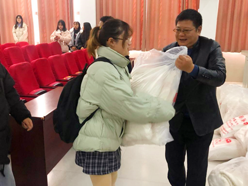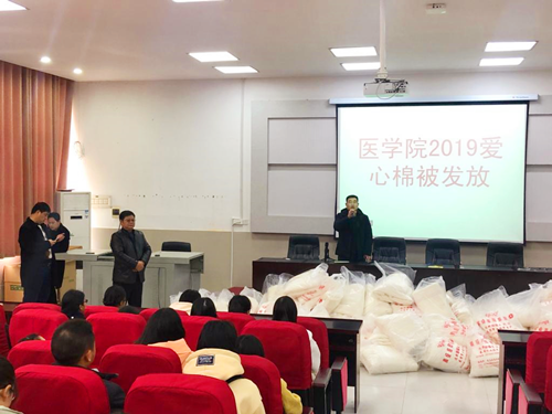学生的冷暖牵系着学院老师们的心。12月3日中午,医学院在南教学楼阶一教室为建档立卡的105名学子发放爱心棉被。医学院党总支书记佘传江、副院长杨雷、学工科科长栗财等参加活动。