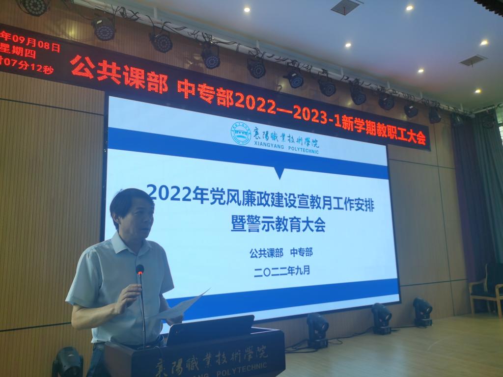 9月8日下午5点,公共课部 中专部在博学楼多功能教室开展党风廉政建设宣教月活动。公共课部、中专部全体党员干部参加。大会由公共课部党总支书记陈建波主持。
