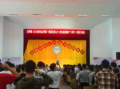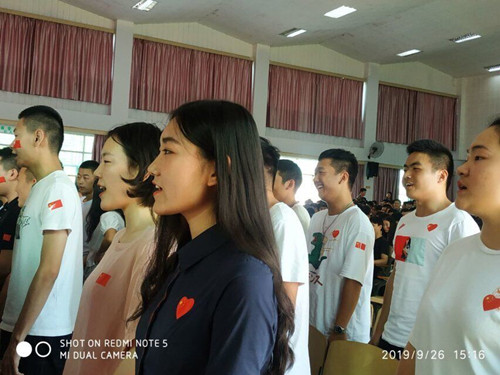 胸前贴有国旗贴,手中高举五星红旗,共同庆祝新中国七十华诞,为祖国献声。9月26日下午,农学院全体师生在大礼堂共过集体团日。